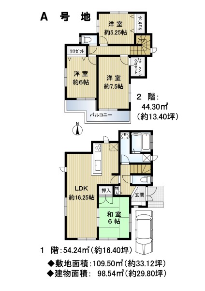 | 専有面積 | 土地面積/109.50㎡(約33.12坪) 延床面積/98.54㎡(約29.80坪) |